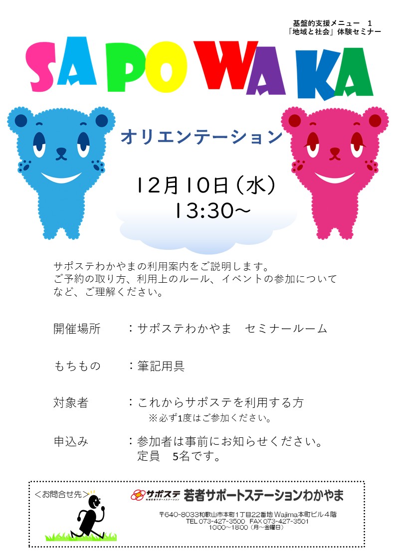 | お申し込み先 | 〒640-8033 和歌山市本町1丁目22番地 Wajima本町ビル4階 お電話またはFAXにて申込みください。 TEL:073-427-3500 FAX:073-427-3501 10:00~18:00 月曜~金曜(祝・お盆・年末年始は休み) |
